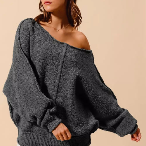 This slouchy bouclé knit with exposed seams offers relaxed comfort fused with textured fashion—ideal for casual chic wardrobes.